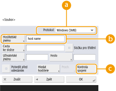 Vyberete-li <Windows (SMB)>, zobrazí se tlačítka <Hledat hostitele> a <Procházet>. Souborový server Rozšířená schránka můžete snadno zadat hledáním nebo prohlížením sítě.