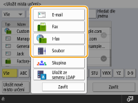 Faxové číslo nebo e-mailovou adresu příjemce, které lze použít při odesílání naskenovaných dokumentů můžete uložit do adresáře. Do adresáře můžete také uložit I-faxové místo určení a umístění složky na souborovém serveru (IP adresu a cestu) a úložiště (Rozšířená schránka) multifunkční tiskárny Canon jako místo určení v adresáři.