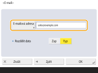 S pomocí této volby zadáte, zda odesílat I-faxy na místa určení přes poštovní server nebo ne. Vyberte <Zap>, chcete-li odesílat I-faxy přes poštovní server. Vyberte <Vyp>, chcete-li odesílat data přímo příjemci na stejné místní síti (LAN). Přímým odesíláním příjemci můžete odesílat velká množství dat, aniž byste zatěžovali poštovní server.