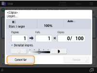 Pokud stisknete tlačítko  (Stop) na ovládacím panelu, když je zobrazena obrazovka Základní funkce pro kopírování, bude tisková úloha přerušena a objeví se zpráva <StopVyberte kopírovací úlohu, kterou chcete zrušit.> a také seznam kopírovacích úloh. Z tohoto seznamu můžete vybrat kopírovací úlohu a zrušit ji stisknutím <Zrušit>.