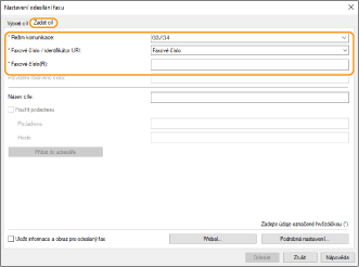 Klikněte na kartu [Zadat cíl] a zadejte používaný režim komunikace a faxové číslo.