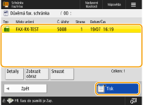 Tato funkce slouží k ukládání přijatých dokumentů splňujících určité podmínky do zadaného úložiště (Důvěrná faxová schránka). Důvěrná faxová schránka obsahuje mnoho schránek, z nichž každou lze chránit s pomocí hesla. Po zadání podmínky, kdy např. zadáte ukládání všech dokumentů ze Společnosti A do Schránky č. 10, budete smět kontrolovat pouze dokumenty, které potřebujete. S pomocí této funkce také můžete zabránit neoprávněným osobám, aby neúmyslně nahlížely do důvěrných dokumentů, a to nastavením hesla. Když indikátor Zpracování/data na ovládacím panelu svítí stálým zeleným světlem, zkontrolujte/vytiskněte uložené dokumenty níže uvedeným postupem.