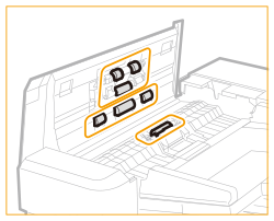 Pokud se na originálech nebo papíru objevují pruhy i po vyčištění podavačeVložte do podavače asi 10 listů velikosti A4 a podle následujících pokynů spusťte <Čistit podavač>. Pokud se zobrazí zpráva oznamující dokončení procesu čištění, použijte podavač pro provedení kopie originálu a zkontrolujte, zda problém přetrvává.