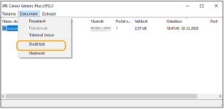 Nemůžete-li najít dokument, který chcete zrušit, tento dokument je již odeslaný do stroje. V takovém případě nemůžete tisk na počítači zrušit.