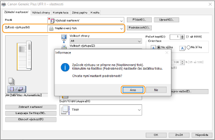 Vyberte [Naplánovaný tisk] z [Způsob výstupu] a klikněte na [Ano].