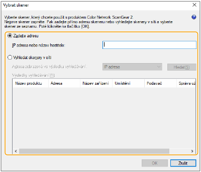 Klikněte na [Zadejte adresu] a zadejte IP adresu nebo hostitelské jméno stroje v textovém poli [IP adresa nebo název hostitele].