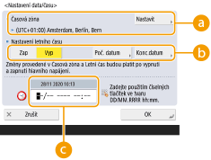 Pro nastavení letního času stiskněte <Zap> a nastavte datum/čas pro <Poč. datum> a <Konc.datum>. Pro nastavení data zadejte den v týdnu a týden v měsíci.