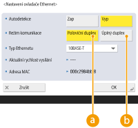 Ethernet je standard určuje metody komunikace v rámci sítě LAN. Obyčejně lze komunikační systém (poloviční duplex / plný duplex) a typ sítě Ethernet (1000BASE-T/100BASE-TX/10BASE-T) nastavit automaticky. Můžete je také nastavit zvlášť po přepnutí nastavení na ruční ovládání.
