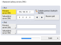 Stiskněte tlačítko <Primární server DNS> a <Sekundární server DNS>, zadejte adresu IPv4/IPv6 pro server DNS a stiskněte <Další>.