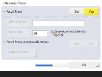 Chcete-li používat proxy, stiskněte <Zap>, stiskněte <Adresa serveru> a <Číslo portu> a zadejte jednotlivé hodnoty a stiskněte <OK>.