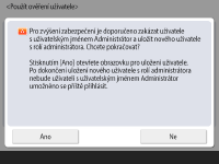 Chcete-li zvýšit zabezpečení zařízení tak, že zakážete uživatele „Administrator“ a zaregistrujete nového administrátora, stiskněte <Ano>. V části <Uložit administrátora> zadejte <Uživatelské jméno> a <Heslo> a stiskněte <OK>. Podle potřeby zadejte <E-mailová adresa>, <ID oddělení> a <Zobrazit jméno>. Další informace viz Uložení uživatelských informací do místního zařízení. Uživatel „Administrator“ bude zakázaný, až se znovu přihlásíte.
