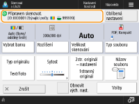 Zde se zobrazuje stav nastavení, např. rozlišení nebo velikost skenování. V zájmu správného naskenování dokumentů nastavení vždy zkontrolujte. Chcete-li nastavení změnit, stiskněte tlačítko pod zobrazením. Další informace o formátech souborů viz