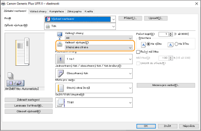 Nastavte [Výstupní velikost] v ovladači tiskárny podle velikosti papíru, na který chcete tisknout.