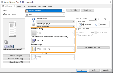 Při kontrole náhledu tisku nastavte [Rozvržení strany] [Pořadí stránek] [Jednostranný tisk / oboustranný tisk / tisk brožury] [Místo pro vazbu].
