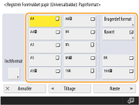 Hvis <Angiv altid> under <Standardindst. for Universalbakke> er indstillet til <Foretrukket papir>, vises en skærm, der giver dig mulighed for at vælge dit foretrukne papir, når lægger papiret i universalbakken. <Standardindst. for Universalbakke>