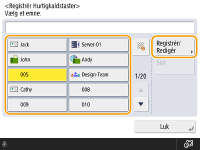Hvis du vil ændre eller slette oplysningerne om de modtagere, der er registreret i hurtigkaldstasterne, kan du se Redigering af de registrerede modtagere i hurtigkaldstaster.