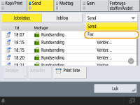 (Stop), når der er flere afsendelsesjob, for at vise skærmbilledet til valg af det afsendelsesjob, der skal annulleres. Hvis det afsendelsesjob, du vil annullere, ikke vises, skal du trykke på <Kontrollér andre job> for at vise <Sendejob>. Vælg det job, som du vil annullere, og tryk på <Annullér>. |