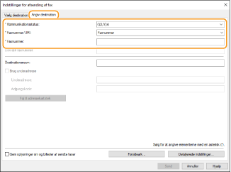 Klik på fanen [Angiv destination], og angiv kommunikationsstatussen og faxnummeret, du bruger.