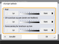 Når indstillingen <Mørk> er valgt, øges de områder, der udskrives med maksimal tæthed. Når indstillingen <Lys> er valgt, kan udfyldte områder, tekst og linjer blive udskrevet som halvtoner med manglende prikker. Denne indstilling skal primært bruges til at justere de midterste tætheder.