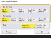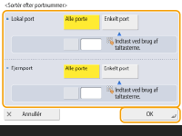 Tryk på <Sortér efter portnummer> for at bruge portnumre ved angivelse af de porte, IPSec skal anvendes på. Vælg <Alle porte> for at anvende IPSec på alle portnumre. For at anvende IPSec på et bestemt portnummer skal du trykke på <Enkelt port> og indtaste portnummeret. Efter angivelse af portene skal du trykke på <OK>. Angiv porten på denne maskine i <Lokal port>, og angiv porten for kommunikationspartneren i <Fjernport>.