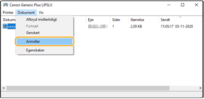 Hvis du ikke kan finde dokumentet, der skal annulleres, er det allerede sendt til maskinen. Er det tilfældet, kan du ikke annullere printningen på computeren.