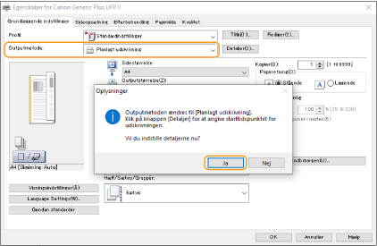 Vælg [Planlagt udskrivning] fra [Outputmetode], og klik på [Ja].