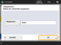 Hvis den angivne mappe allerede findes, gemmes det scannede dokument i denne mappe. Hvis den angivne mappe ikke findes, oprettes en mappe med det angivne navn, og det scannede dokument gemmes i den oprettede mappe.