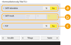 For at kryptere kommunikationen til/fra SMTP-serveren med TLS skal du trykke på <Til>. Når <Til> er valgt, kan du bekræfte TLS-servercertifikatet under kommunikation med serveren og føje CN til verificeringsemnerne. <E-mail-/I-faxindstillinger>