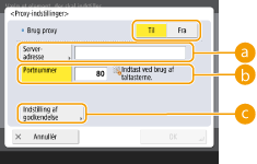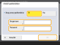 Tryk på dette for at angive godkendelsesoplysningerne, når du bruger en proxyservers godkendelsesfunktion. Tryk på <Til> på den viste skærm, angiv brugernavnet og adgangskoden til proxygodkendelse, og tryk på <OK>.