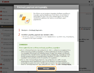 Αν κάνετε κλικ στο εικονίδιο, η τρέχουσα σελίδα μπορεί να σκουρύνει και να εμφανιστεί ένα αναδυόμενο παράθυρο. Για να επιστρέψετε στη σελίδα, κάντε κλικ στο [Κλείσιμο] στο αναδυόμενο παράθυρο.