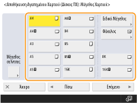 Αν καταχωρήσετε το μέγεθος του χαρτιού που χρησιμοποιείτε συχνά στα πλήκτρα <S1> έως <S4>, μπορείτε να τα εμφανίζετε με ένα άγγιγμα. Καταχώριση χαρτιού ελεύθερου μεγέθους (Χαρτί προσαρμοσμένου μεγέθους)