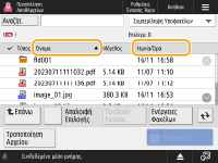 Όταν υπάρχουν πολλαπλές εργασίες/αρχεία σε μια λίστα, πατήστε <Όνομα> ή <Ημνία/Ώρα> για την ταξινόμηση των στοιχείων της λίστας. Όταν εμφανίζεται η ένδειξη