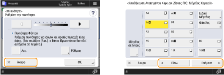 Επιπλέον, εμφανίζονται πλήκτρα όπως το <Άκυρο> το οποίο ακυρώνει τη ρύθμιση και σας επαναφέρει στην προηγούμενη οθόνη, το <Επόμενο> το οποίο εφαρμόζει τη ρύθμιση και σας οδηγεί στην επόμενη οθόνη, το <Πίσω> το οποίο σας επαναφέρει στην προηγούμενη οθόνη και το <Κλείσιμο> το οποίο κλείνει την οθόνη που εμφανίζεται αυτήν τη στιγμή.