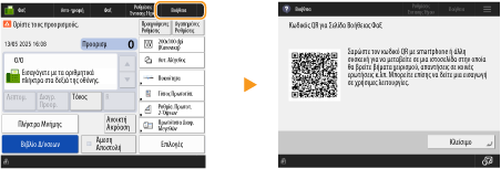 Όταν πατήσετε την επιλογή <Βοήθεια> στη βασική οθόνη της λειτουργίας Φαξ ή Σάρωσης, εμφανίζεται ένας κωδικός QR για πρόσβαση στις σελίδες Φαξ ή Σάρωσης του Οδηγός Χρήστη.
