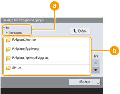 (Ρυθμ./Αποθήκ.) για να εμφανιστεί η οθόνη <Ρυθμίσεις/Αποθήκευση>. Πατήστε αυτό το πλήκτρο πρώτα για να κάνετε αλλαγές για κάθε ρύθμιση, όπως ρυθμίσεις χαρτιού, ρυθμίσεις οθόνης και ρυθμίσεις δικτύου. Σε αυτήν την οθόνη, μπορείτε επίσης να καταχωρίσετε προορισμούς, όπως διευθύνσεις e-mail και αριθμούς φαξ.