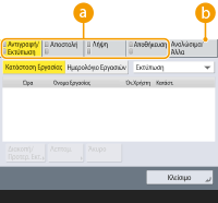 (ΈλεγχοςΚατάστ), εμφανίζεται η οθόνη <ΈλεγχοςΚατάστ>. Σε αυτήν την οθόνη, μπορείτε να ελέγξετε την κατάσταση εκτύπωσης και την κατάσταση αποστολής, καθώς και το απόθεμα γραφίτη και μνήμης.