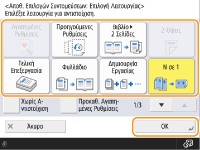 Καταχώριση στις ρυθμίσεις <Αγαπημένες Ρυθμίσεις>Στις ρυθμίσεις <Αγαπημένες Ρυθμίσεις>, μπορείτε να καταχωρίσετε τις συχνά χρησιμοποιούμενες διαδικασίες για τη λειτουργία αντιγραφής, καθώς και τους συχνά καθοριζόμενους προορισμούς και τις ρυθμίσεις για τη λειτουργία σάρωσης. Για περισσότερες πληροφορίες, ανατρέξτε στην ενότητα Αποθήκευση συνδυασμού των συχνά χρησιμοποιούμενων λειτουργιών.