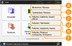 <Περιορισμός Εμφάνισης Λειτουργιών>: Επιλέξτε τις λειτουργίες ή τις εφαρμογές MEAP που θα αποκρύψετε στην <Αρχική> οθόνη.