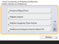 ![]() <Ρυθμίσεις Διαχείρισης Αρχικής> <Περιορισμός Εμφάνισης Λειτουργιών> <Ρύθμιση> και ορίστε την εμφάνιση του <Συντόμ. για Ρυθμ./Αποθήκ.>.Συντομεύσεις που μπορείτε να καταχωρήσετε: 10