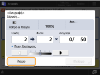 Εάν πατήσετε  (Διακοπή) στον πίνακα ελέγχου ενώ εμφανίζεται η οθόνη βασικών λειτουργιών αντιγραφής, η εργασία αντιγραφής διακόπτεται και εμφανίζεται το μήνυμα <ΣτοπΕπιλέξτε εργασία αντιγραφής για ακύρωση.> καθώς και η λίστα εργασιών αντιγραφής. Μπορείτε να επιλέξετε την εργασία αντιγραφής από τη λίστα και να ακυρώσετε την εργασία πατώντας <Άκυρο>.