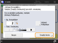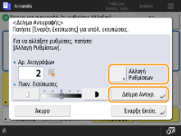 Πατήστε <Αλλαγή Ρυθμίσεων> για να αλλάξετε τις ρυθμίσεις. Η ένδειξη <Δείγμα Αντιγραφής> εμφανίζεται μετά την αλλαγή των ρυθμίσεων. Εκτυπώστε ξανά ένα δείγμα.