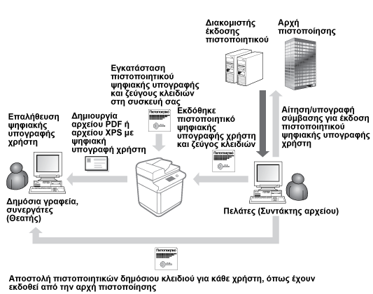 Το κλειδί και το πιστοποιητικό (πιστοποιητικό χρήστη) που απαιτούνται για την προσθήκη υπογραφής χρήστη μπορούν να καταχωριστούν μέσω του Remote UI. Ορίστε έναν διαχειριστή για την καταχώριση αυτών των στοιχείων. Μετά την καταχώρισή τους, οι χρήστες που συνδέονται μέσω ατομικού ελέγχου ταυτότητας μπορούν να προσθέσουν ψηφιακή υπογραφή σε σαρωμένα έγγραφα που αποστέλλονται σε συγκεκριμένη μορφή αρχείου. Προσθήκη ψηφιακής υπογραφής
