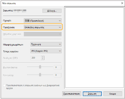 Εάν σαρώνετε πάντα με τις ίδιες ρυθμίσεις, ακολουθήστε τις παρακάτω διαδικασίες για να καταχωρήσετε τις ρυθμίσεις. Μπορείτε να τις ανακαλείτε εύκολα και βολικά κατά τη σάρωση. Επιλέξτε [Προσθήκη προφίλ] από την αναπτυσσόμενη λίστα [Προφίλ]  Καθορίστε τις ρυθμίσεις σάρωσης που θέλετε να καταχωρίσετε  Εισαγάγετε ένα όνομα στο πλαίσιο κειμένου [Όνομα προφίλ]  Κάντε κλικ στο [Αποθήκευση προφίλ]