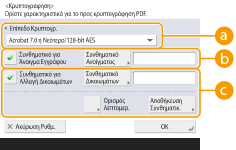 Επιλέξτε το επίπεδο κρυπτογράφησης. Αν επιθυμείτε να χρησιμοποιήσετε το <Acrobat 9.0 ή Ισοδύναμο/256-bit AES> αντί για το <Acrobat 10.0 ή Ισοδύναμο/256-bit AES> ως επίπεδο κρυπτογράφησης, χρησιμοποιήστε αυτήν τη ρύθμιση για να αλλάξετε τις επιλογές που μπορείτε να κάνετε.