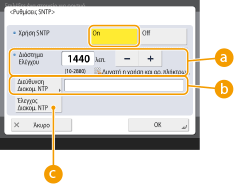 Πατήστε <On> στο <Χρήση SNTP> και εφαρμόστε τις κατάλληλες ρυθμίσεις.