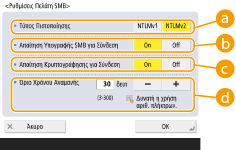 Όταν η ρύθμιση <Απαίτηση Κρυπτογράφησης για Σύνδεση> έχει οριστεί σε <On>, η συσκευή μπορεί να συνδεθεί μόνο σε διακομιστές SMB που υποστηρίζουν την κρυπτογραφημένη επικοινωνία SMB v3.0/3.1. Όταν οι επιλογές <1.0> και <2.0> έχουν ρυθμιστεί σε <On> για την επιλογή <Ορισμός Έκδοσης Πελάτη SMB>, αλλά η επιλογή <3.0> δεν έχει ρυθμιστεί σε <On>, η συσκευή δεν μπορεί να συνδεθεί με διακομιστές SMB που δεν υποστηρίζουν την κρυπτογραφημένη επικοινωνία SMB v3.0.