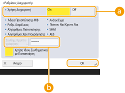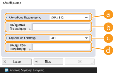 Εάν χρησιμοποιείτε κωδικό πρόσβασης διαφορετικό από την πιστοποίηση, ακυρώστε την επιλογή <Χρήση Ίδιου Συνθημα- τικού με Πιστοποίηση>, πατήστε <Συνθημ. Κρυ- πτογράφησης> και εισαγάγετε τον κωδικό πρόσβασης.