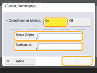 Πατήστε το για να ορίσετε τις πληροφορίες πιστοποίησης κατά τη χρήση της λειτουργίας πιστοποίησης ενός διακομιστή μεσολάβησης. Πατήστε <On> στην οθόνη που εμφανίζεται, εισαγάγετε το όνομα χρήστη και τον κωδικό πρόσβασης που θα χρησιμοποιούνται για την πιστοποίηση μέσω διακομιστή μεσολάβησης και πατήστε το <OK>.