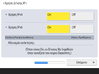 Πατήστε <On> για το <Χρήση IPv4> ή το <Χρήση IPv6> και, στη συνέχεια, πατήστε <Επόμενο>. Μπορείτε να χρησιμοποιήσετε και IPv4 και IPv6.