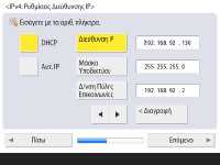 Για αυτόματη λήψη της διεύθυνσης IP, πατήστε <DHCP> ή <Αυτ. IP> και, στη συνέχεια, πατήστε <Επόμενο> ή <OK>.